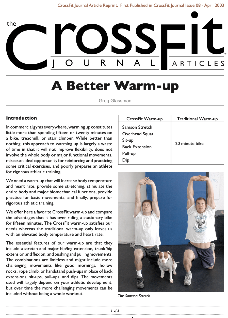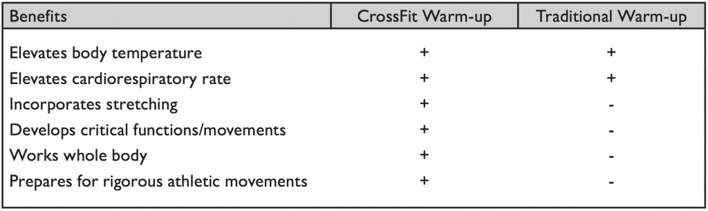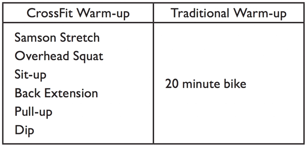 We offer here a favorite CrossFit warm-up and compare the advantages that it has over riding a stationary bike for 15 minutes. The CrossFit warm-up satisfies our needs whereas the traditional warm-up only leaves us with an elevated body temperature and heart rate.
