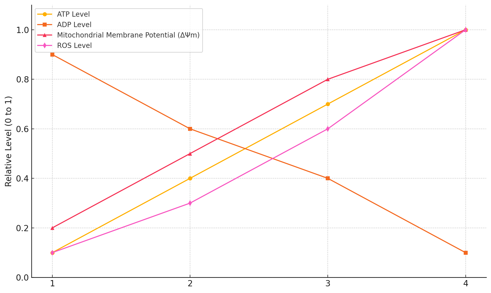 Figure 12 provides a general pattern of bioenergetic states from severe energy stress at one end of the spectrum and the well-fed state at the other. During the postabsorptive phase (i.e., fasting), there can be relatively low levels of mitochondrial ATP to ADP, DPsim, and ROS. Figure 12 is somewhat exaggerated for effect, but it gives a general sense of the typical patterns.
