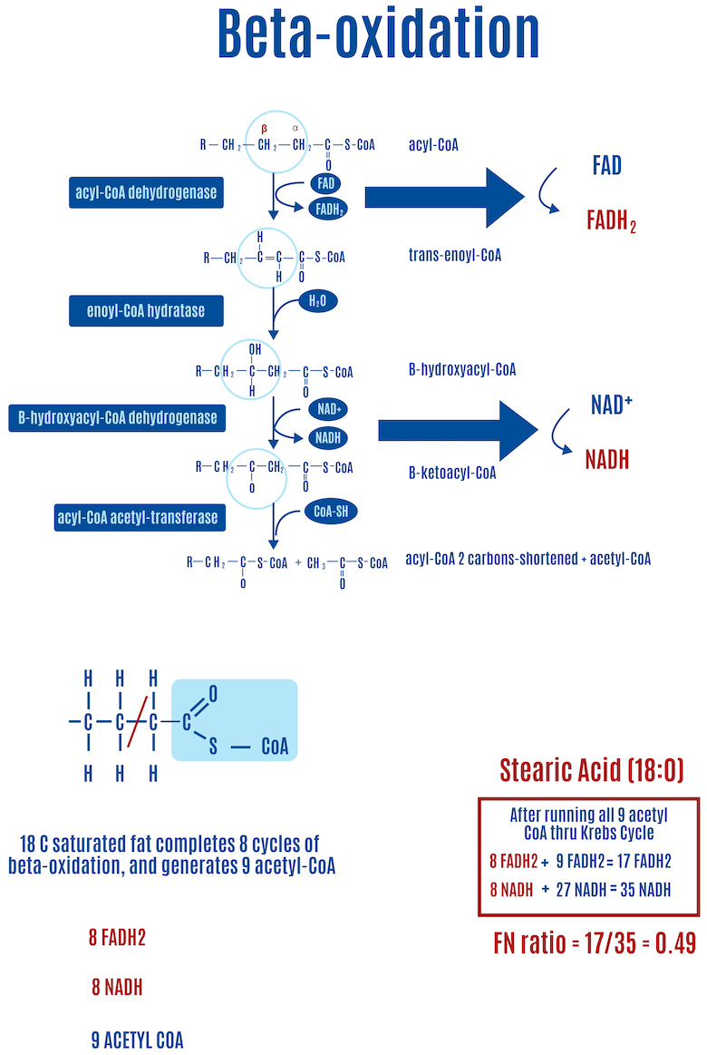 For saturated fats such as stearic acid (18:0, where the number on the left of the colon represents the number of carbons and the number on the right is the number of double bonds), in each round of beta-oxidation the first step of beta-oxidation creates a double bond, releasing an electron that FADH2 captures. During the third step, another electron is released, and an NADH captures it this time, as shown in Figure 13. For every round of beta-oxidation, one FADH2 and one NADH are generated in addition to the ones generated in the Krebs cycle.