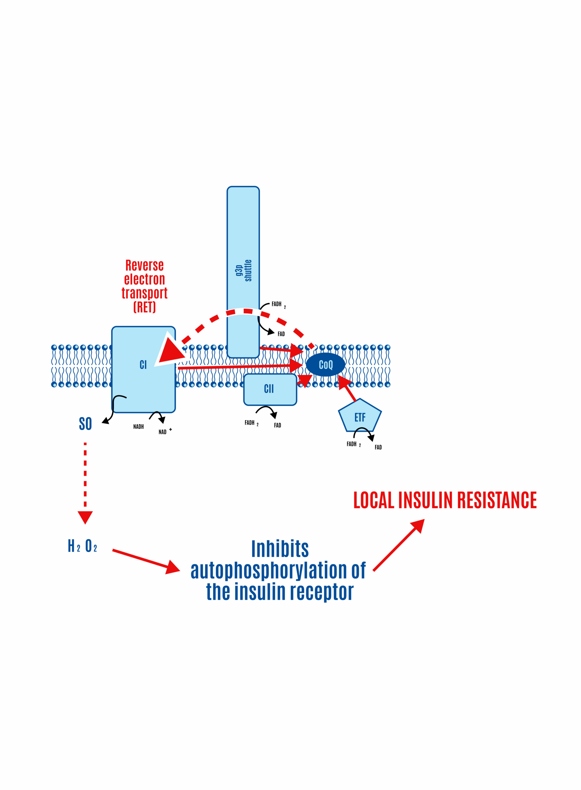 If most CoQ is present in its reduced form as CoQH2, there is no location to accept electrons. CII and ETFdh will attempt to place electrons onto the CoQ couple in competition with CI. Given a high membrane voltage, electrons from FADH2 can be transported in reverse through CI. This can lead to high physiological levels of ROS, which limit insulin signaling and, consequently, nutrient ingress into the cell.