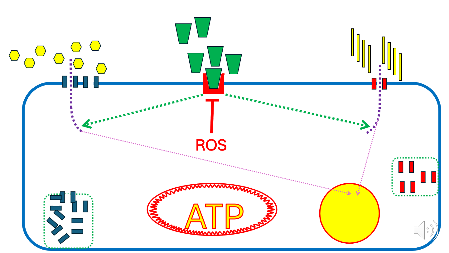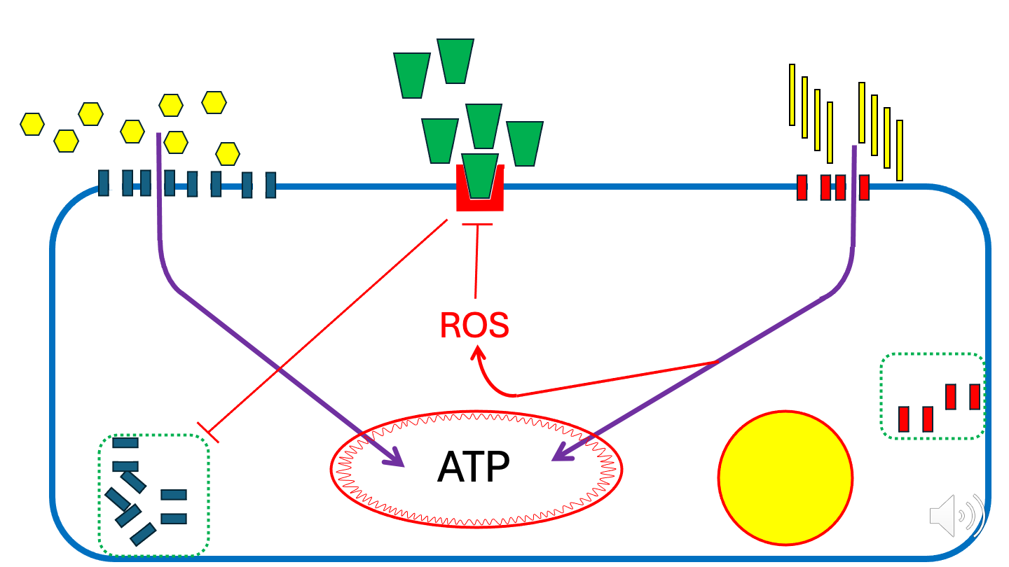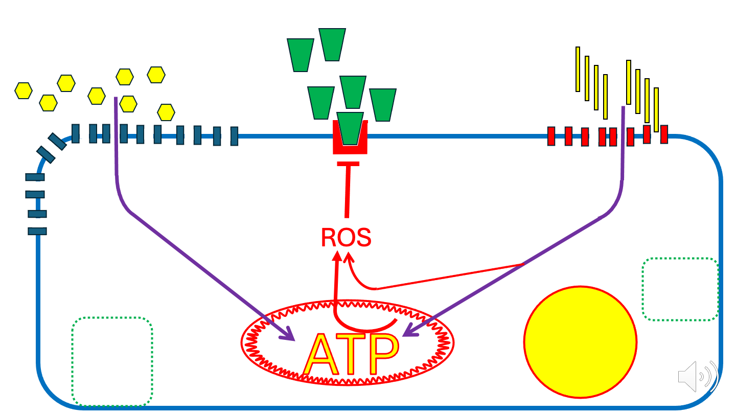 - It’s again a negative feedback: glucose enters and is consumed by the mitochondria. When the mitochondria have had enough, they say so by communicating via a ROS signal that shuts down or severely limits glucose ingress.