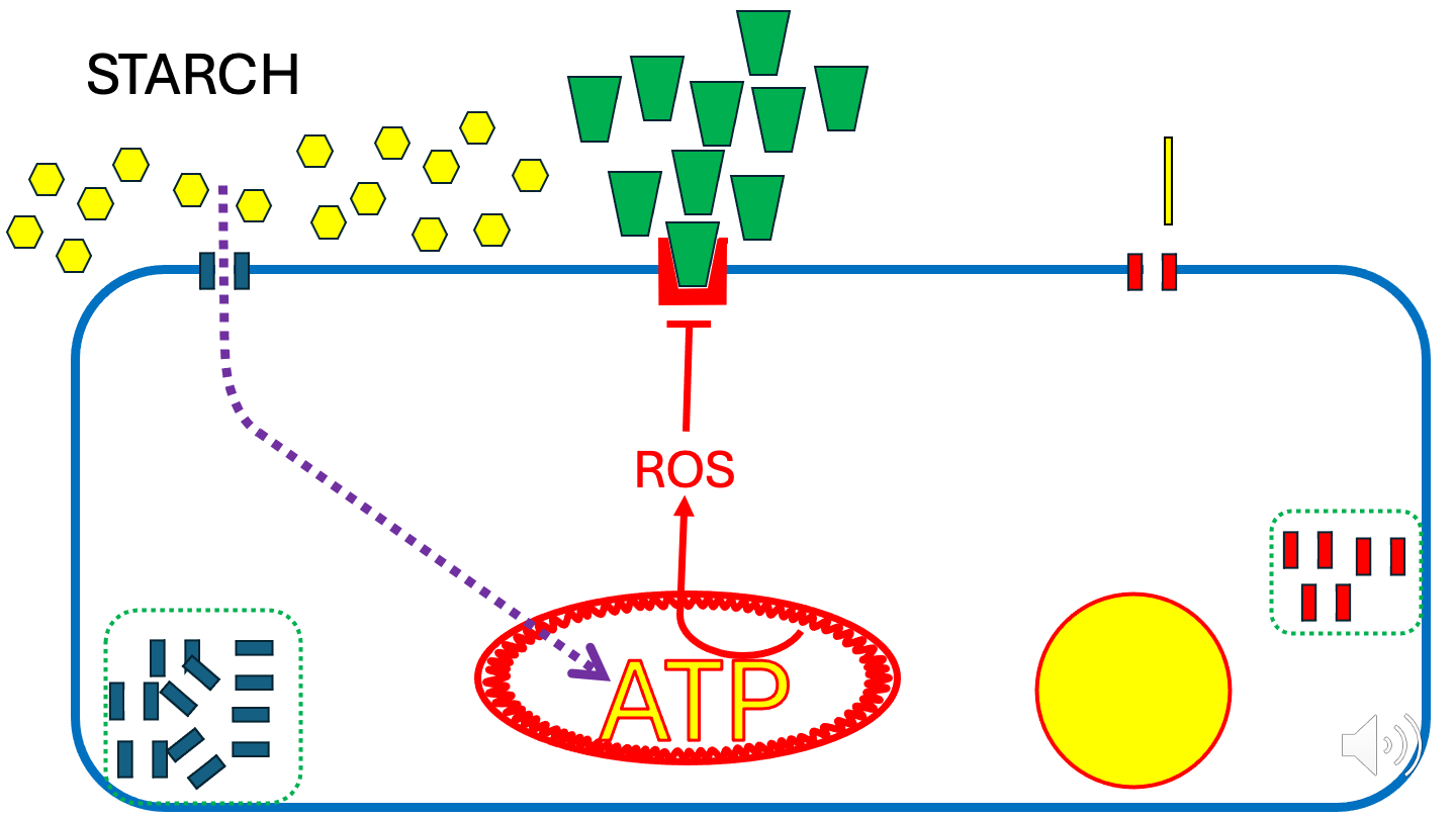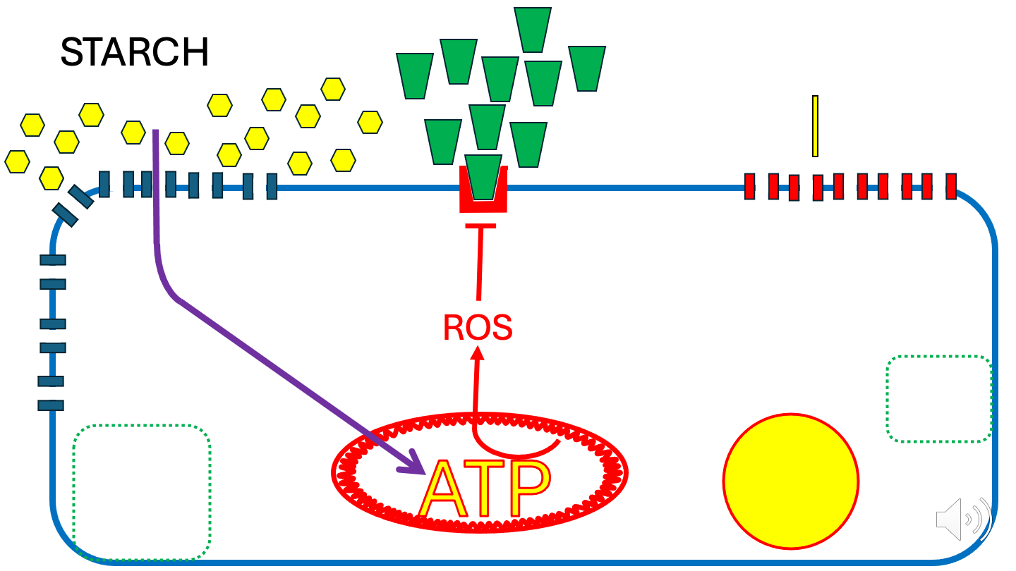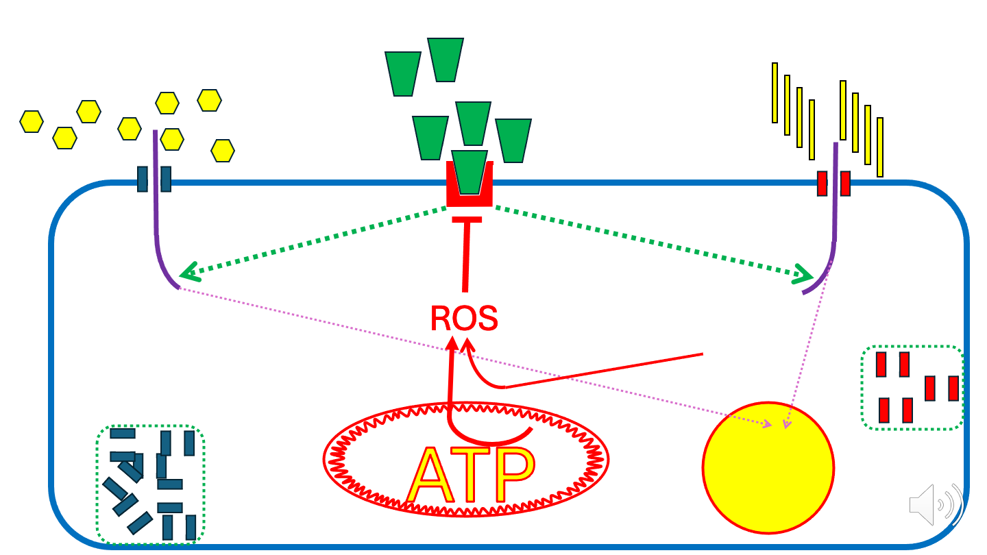 - It’s again a negative feedback: glucose enters and is consumed by the mitochondria. When the mitochondria have had enough, they say so by communicating via a ROS signal that shuts down or severely limits glucose ingress.