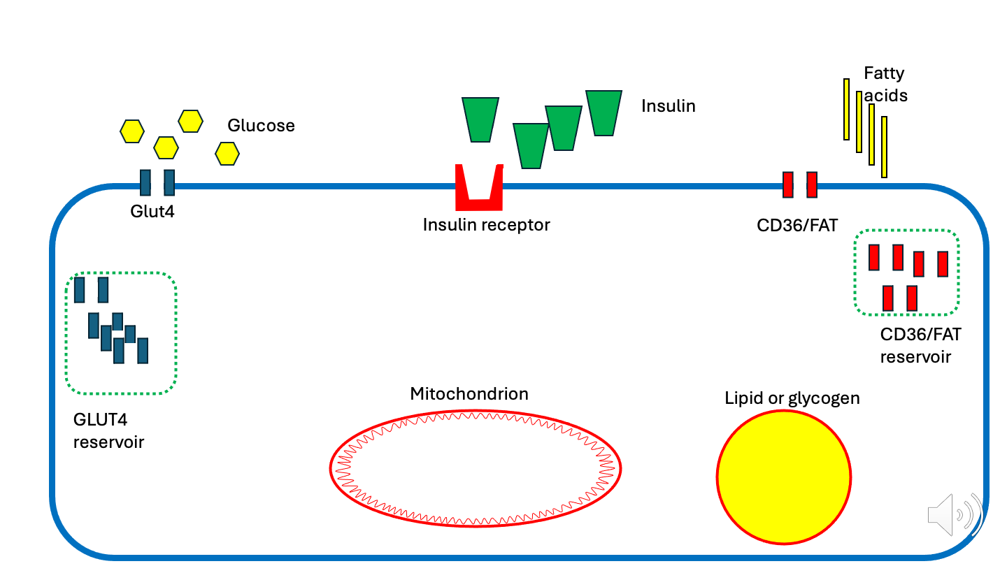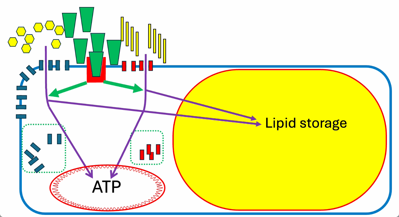 - Red vertical rectangles: CD36/FAT (FA transporters; facilitate FA entry into cell)