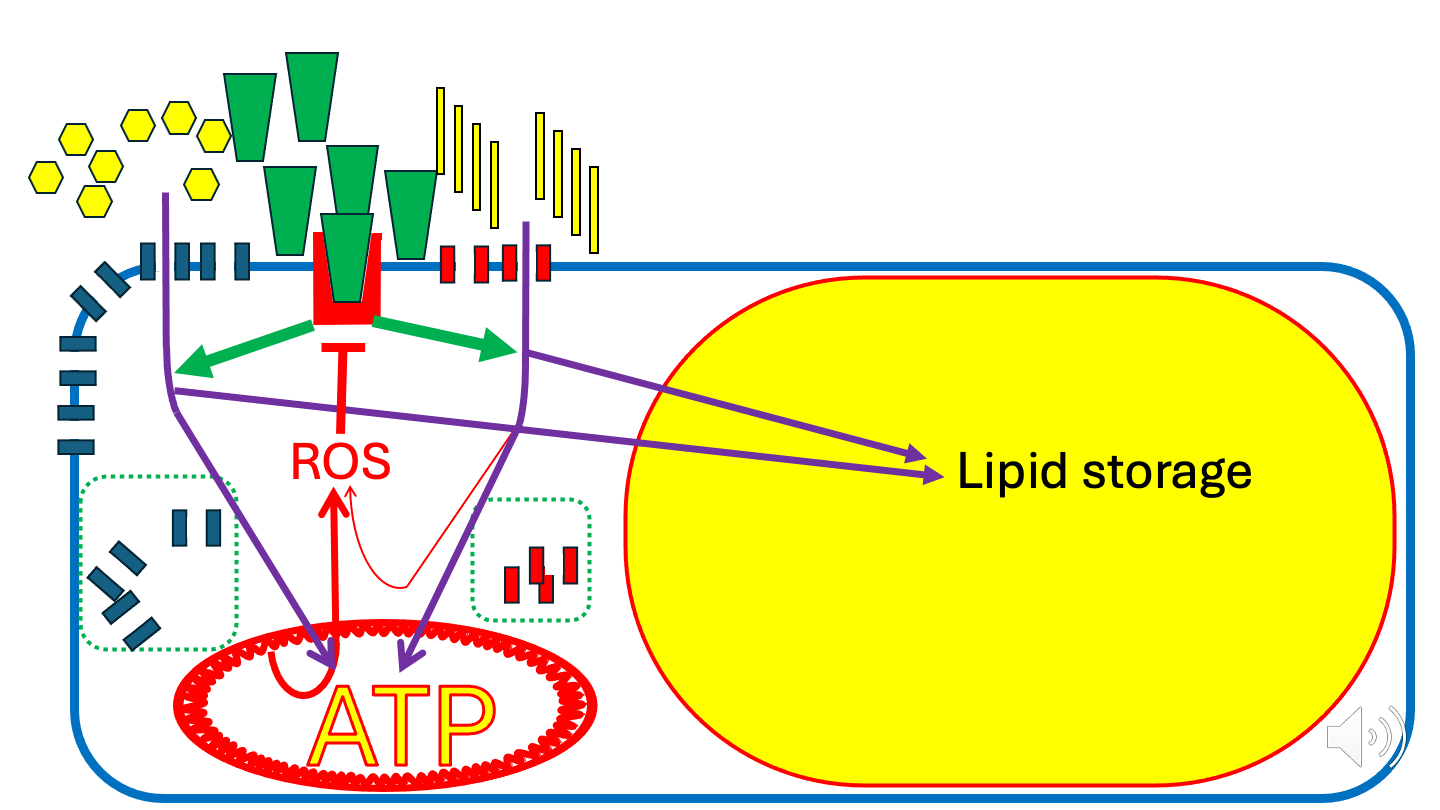 - What shuts down nutrient ingress (see dotted purple lines from glucose and FFAs in Figure 13) also shuts down nutrient storage (i.e., ROS).