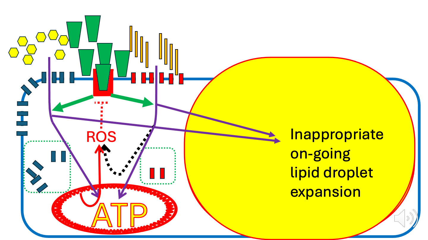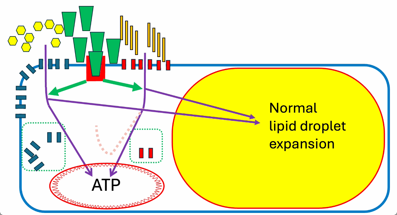 - We have continued diverting nutrients into lipid droplets for storage. Therefore, we have inappropriate ongoing lipid droplet expansion, on the way to obesity (Figure 19).