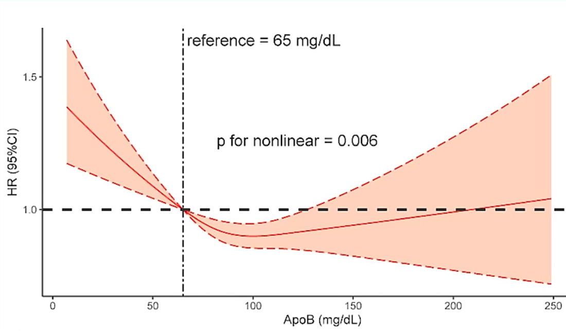 Credit: Huanqiang Li et al., Frontiers in Cardiovascular Medicine 2022 Jan 25;9:822626. Paradoxical Association Between Baseline Apolipoprotein B and Prognosis in Coronary Artery Disease: A 36,460 Chinese Cohort Study. All-cause mortality is displayed on the y-axis and ApoB level on the x-axis. (A word of caution: this is a Chinese study and even a significant percentage of Chinese scientists admit to falsifying data to get published. So grain of salt.)