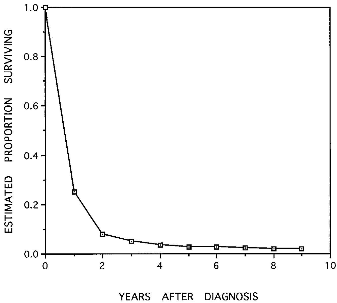 Figure 2 (from Davis et al., 1998) | Survival curves for GBM patients diagnosed from 1981 to 1991 in the U.S.