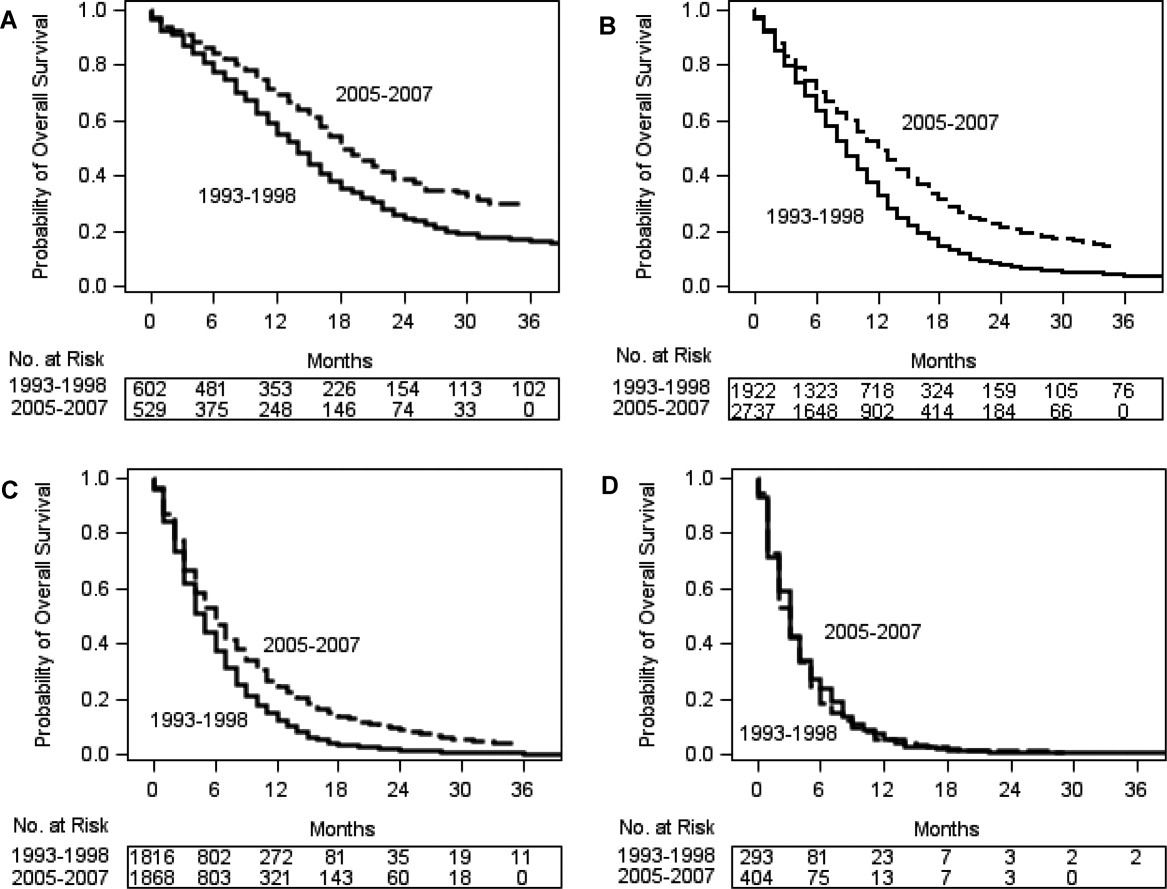 Age group: (A) 20 to 44 years. (B) 45 to 64 years. (C) 65 to 79 years. (D) 80+ years. Median OS from 1993 to 1995 and 2005 to 2007, 7.5 months to 9.5 months, respectively
