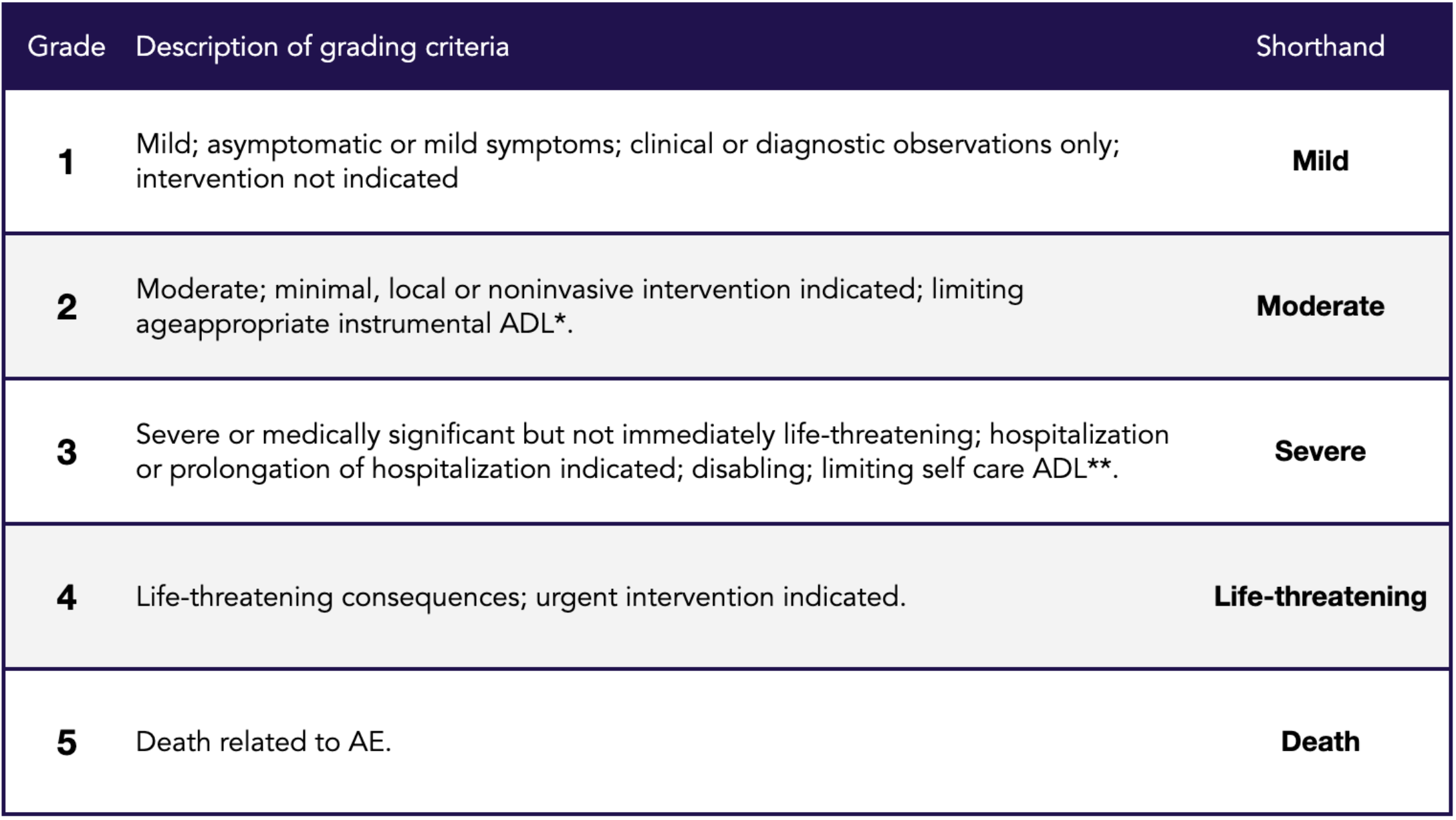 An Adverse Event (AE) is any unfavorable and unintended sign (including an abnormal laboratory finding), symptom, or disease temporally associated with the use of a medical treatment or procedure that may or may not be considered related to the medical treatment or procedure. Grade refers to the severity of the AE. A Semi-colon indicates ‘or’ within the description of the grade.