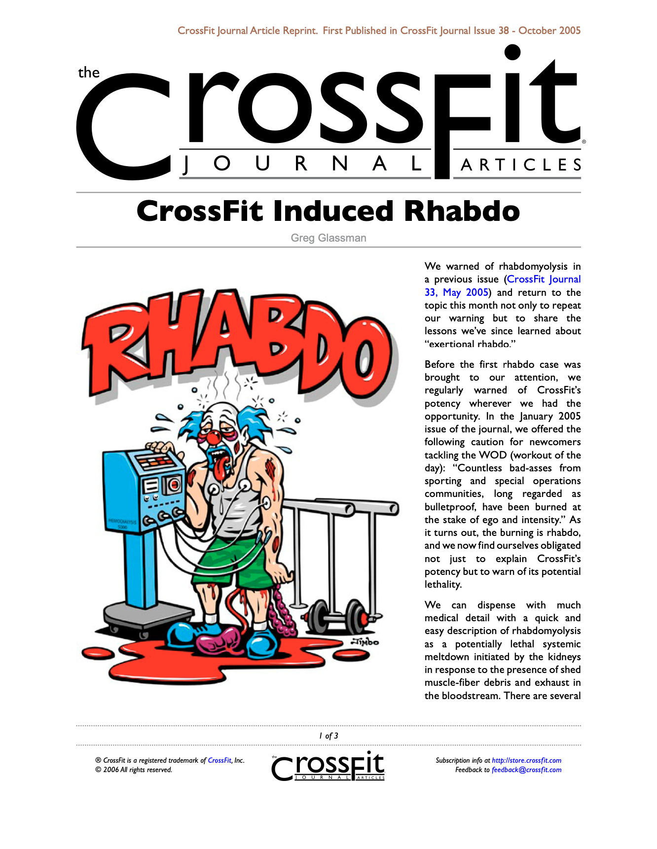 Before the first rhabdo case was brought to our attention, we regularly warned of CrossFit’s potency wherever we had the opportunity. In the January 2005 issue of the journal, we offered the following caution for newcomers tackling the WOD (Workout of the Day): “Countless bad-asses from sporting and special operations communities, long regarded as bulletproof, have been burned at the stake of ego and intensity.” As it turns out, the burning is rhabdo, and we now find ourselves obligated not just to explain CrossFit’s potency but to warn of its potential lethality.