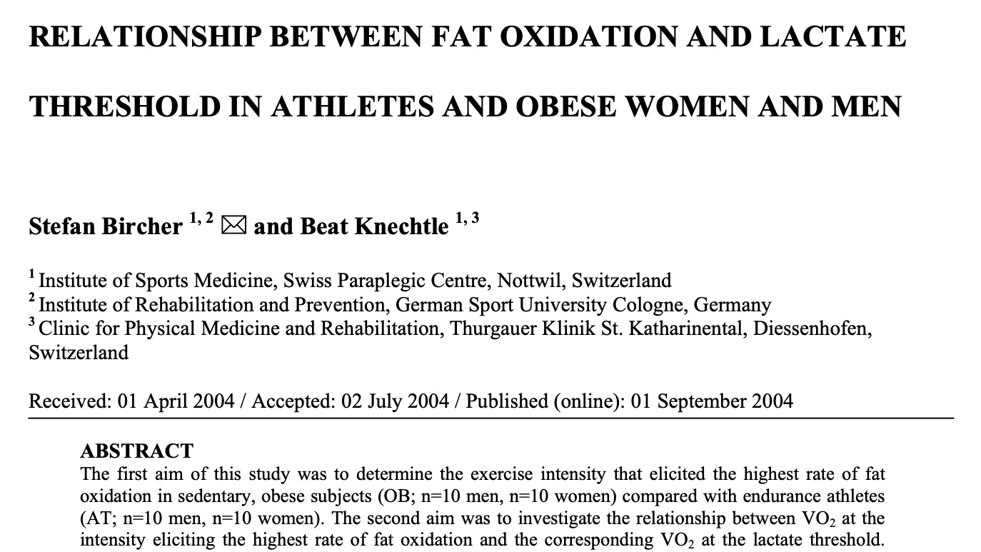 This study compared endurance-trained athletes with obese men and women to explore how fat oxidation relates to lactate threshold during graded treadmill exercise. Using indirect calorimetry, the authors found that the athletes reached peak fat oxidation at higher intensities and closer to their lactate threshold, whereas obese participants did so at much lower workloads. While the athlete group happened to be endurance-trained, the results point more