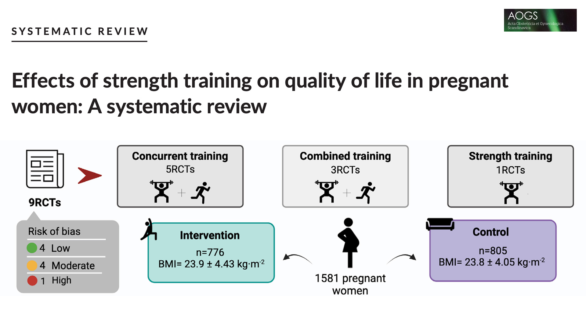 This systematic review of nine randomized controlled trials involving over 1,500 pregnant women found that strength training enhances multiple aspects of maternal health. Regular resistance exercise was linked to reduced back and sciatic pain, better mood and energy levels, improved sleep, and prevention of excessive weight gain. These benefits extended beyond those seen with aerobic activity alone, suggesting that adding strength training can improve both physical and psychological quality of life during pregnancy. The authors recommend incorporating resistance exercise into standard prenatal fitness guidelines.
