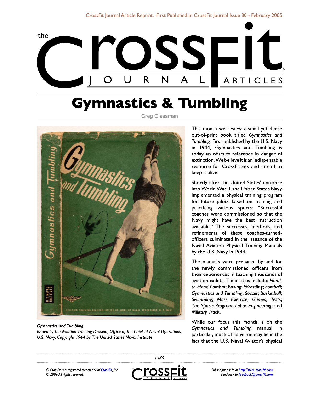 In our Santa Cruz, CA, facility, our better athletes play with and practice basic gymnastics movements regularly if not daily. We have parallel bars, rings, mats, and a pommel horse set up at all times. Unfortunately, this aspect of our local athletes’ training hasn’t carried over strongly to our Internet friends following the WOD (Workout of the Day). A lack of equipment and • Generally fostering stronger gymnastics awareness, participation, and instruction through the CrossFit website We want you to use Gymnastics and Tumbling for inspiration, as a checklist for movements learned, as a means to discover new lowchallenge bodyweight exercises, and as a contextual reference for greater gymnastics involvement and communication.