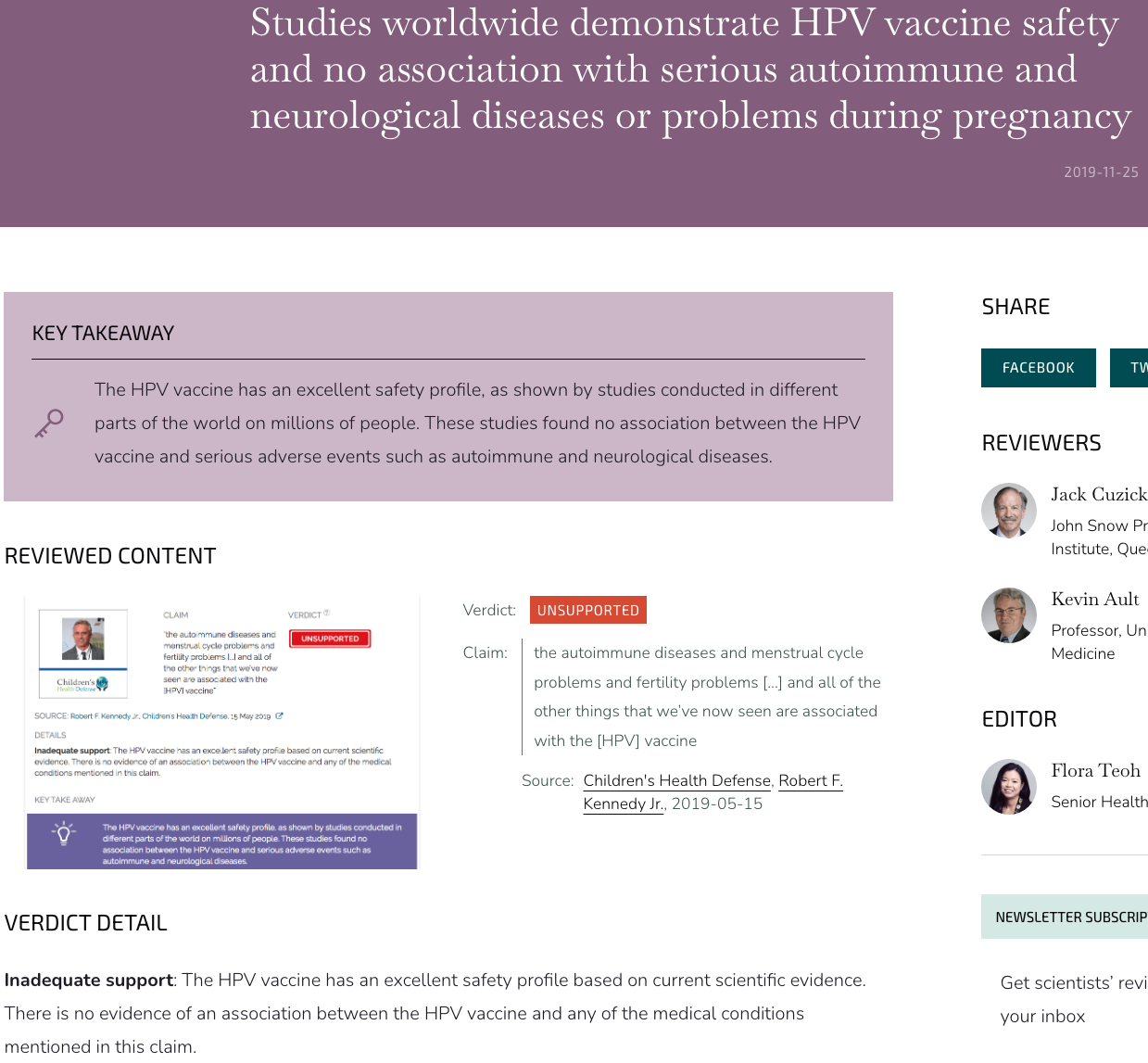 Verdict detail: “Inadequate support: The HPV vaccine has an excellent safety profile based on current scientific evidence. There is no evidence of an association between the HPV vaccine and any of the medical conditions mentioned in this claim” (Science Feedback, 191125).