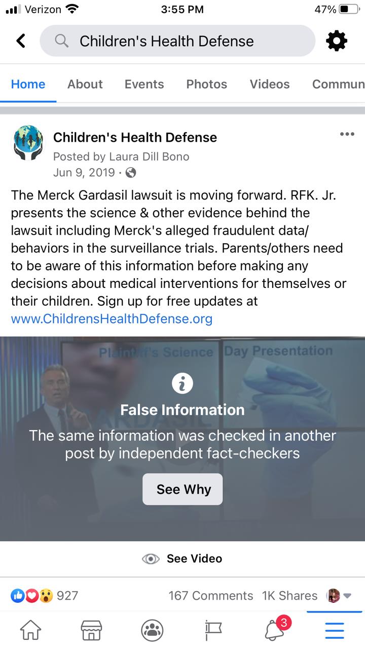 On or about June 9, 2019, CHD’s Facebook page posted a link to a video presentation of RFK Jr discussing a pending lawsuit against Merck related to the Gardasil (HPV) vaccine (Figure 1). RFK Jr also posted a link to the presentation on his Instagram page. Science Feedback checked information in the video, an ‘independent third-party fact checker’ working with Meta (which owns Facebook and Instagram, among other platforms).