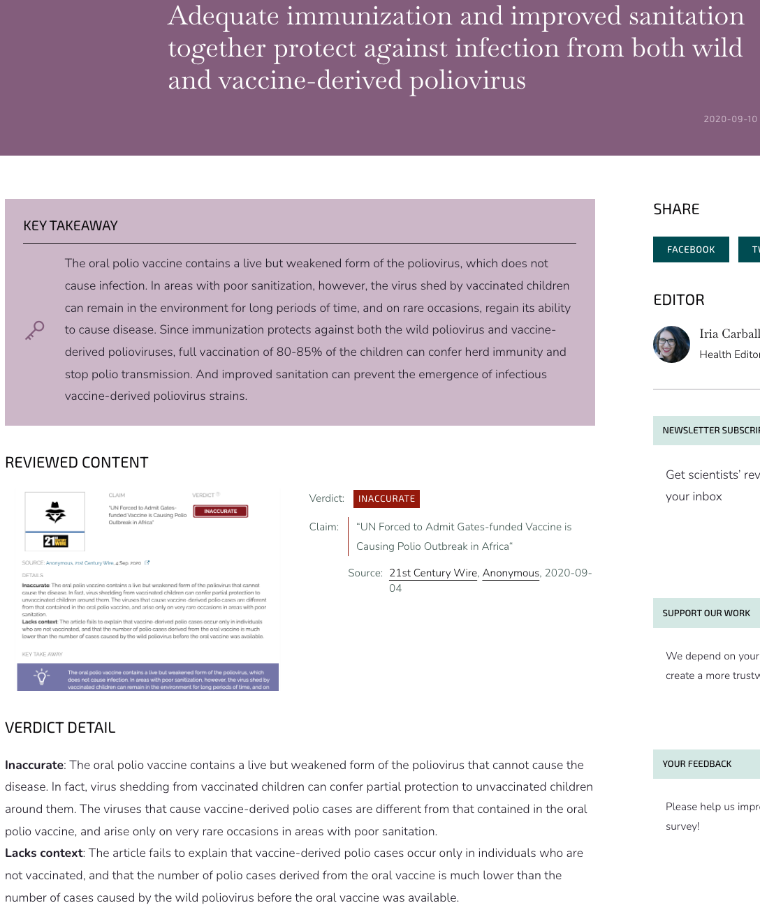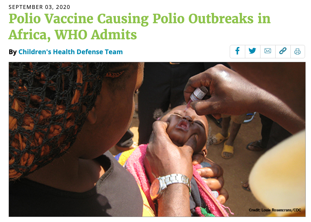 “Lacks context: The article fails to explain that vaccine-derived polio cases occur only in individuals who are not vaccinated, and that the number of polio cases derived from the oral vaccine is much lower than the number of cases caused by the wild poliovirus before the oral vaccine was available” (Science Feedback, 200910).
