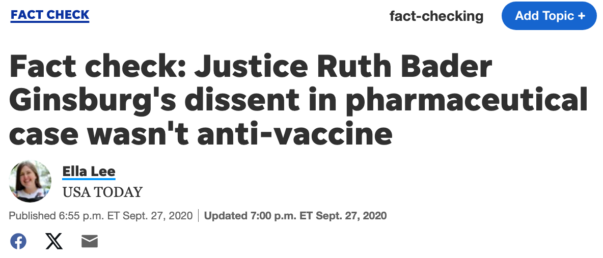 - USA TODAY determined that RFK Jr’s editorial tribute to RBG was “missing context, because it could be misleading” in a fact-check entitled “Justice Ruth Bader Ginsburg’s dissent in pharmaceutical case wasn’t anti-vaccine” (200927).