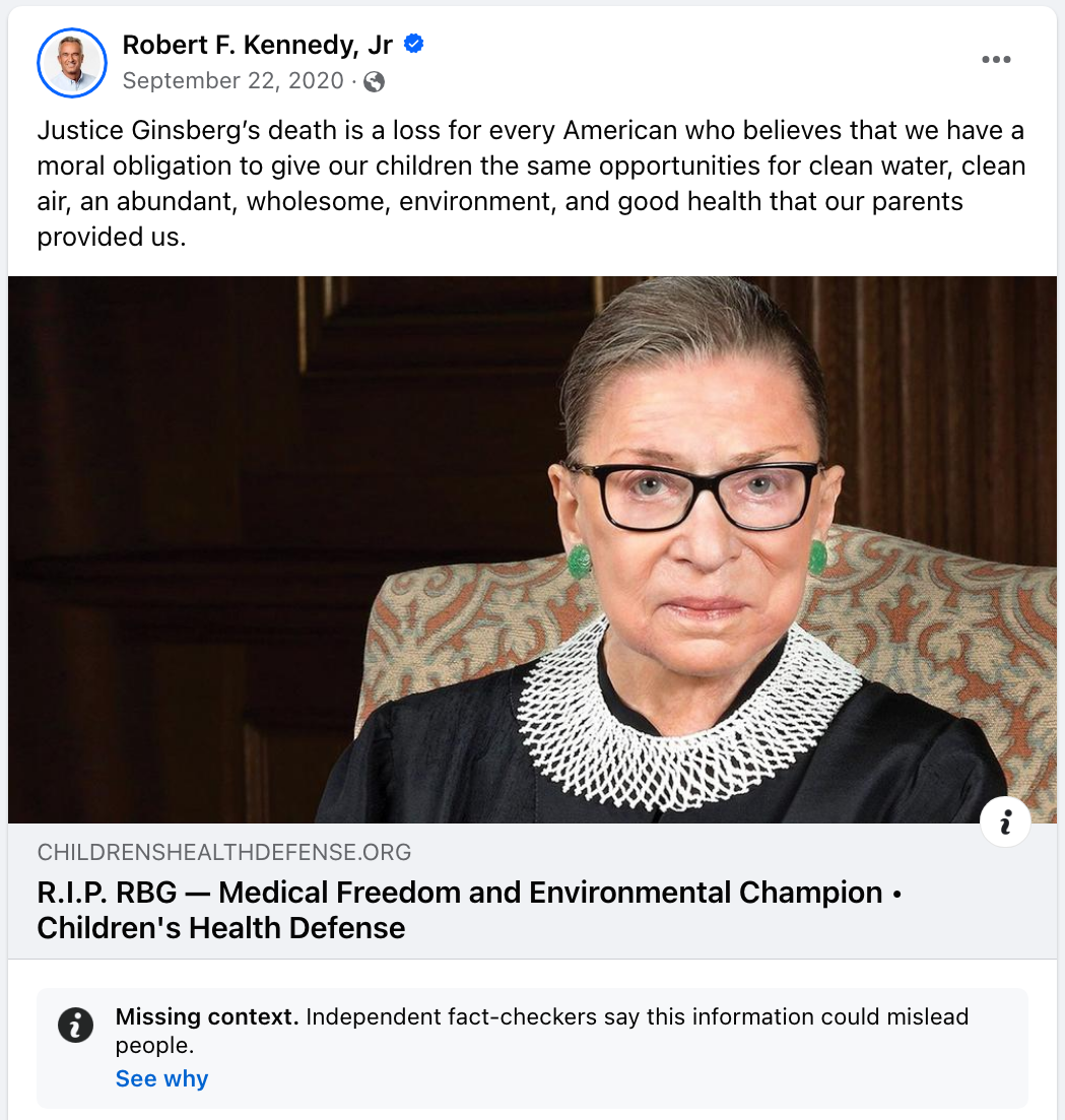 On or about September 20, 2020, CHD’s (and RFK Jr’s) Facebook page posted a link to an editorial tribute to Ruth Bader Ginsburg (“RBG”) entitled “R.I.P. RBG” (Figure 1). Information in the article was checked by USA TODAY, an ‘independent third-party fact checker’ working with Meta (which owns Facebook and Instagram, among other platforms).
