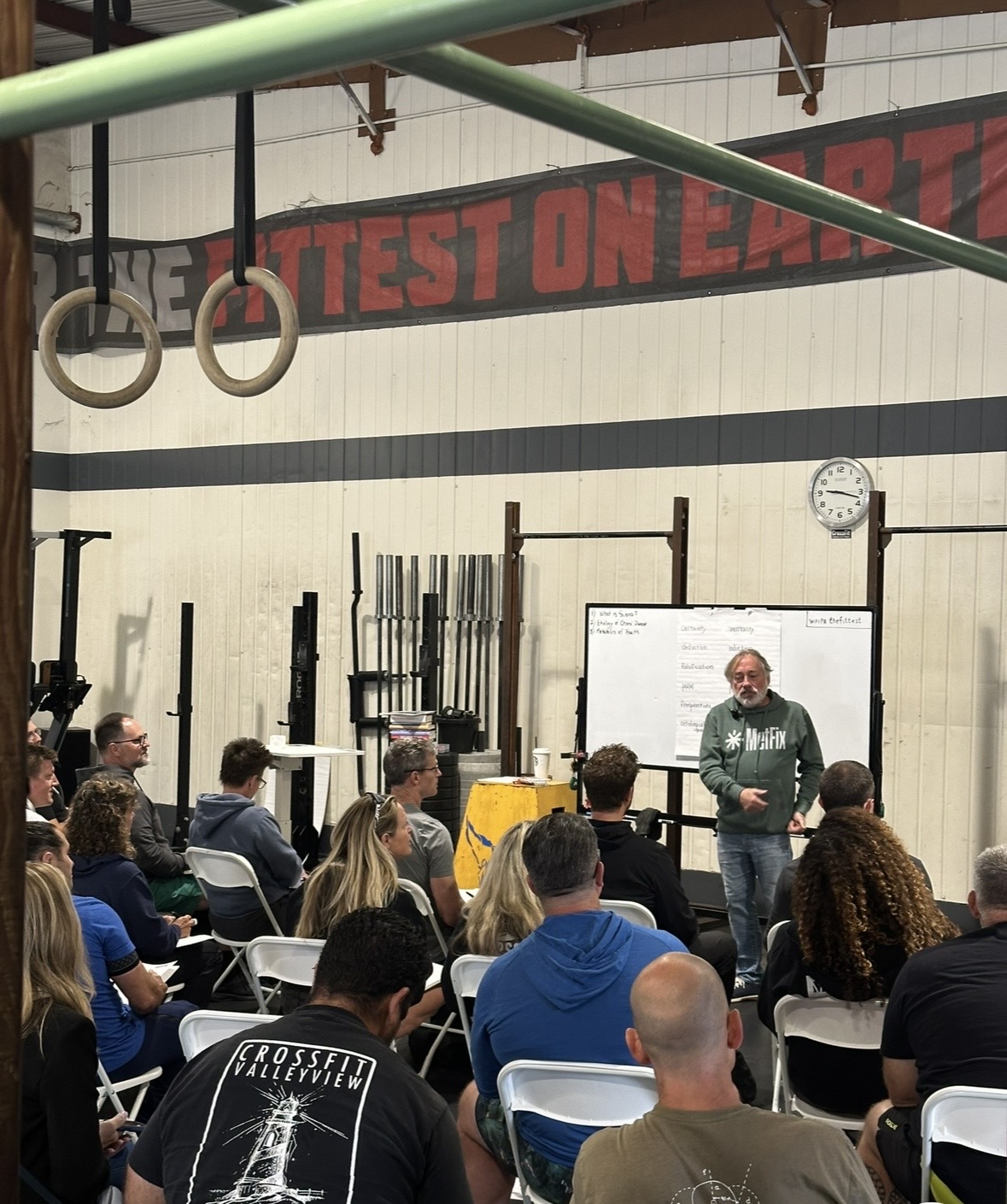 Pigment dyed Alpine Green, with white screen print. Mid weight. Whiteboard ready.