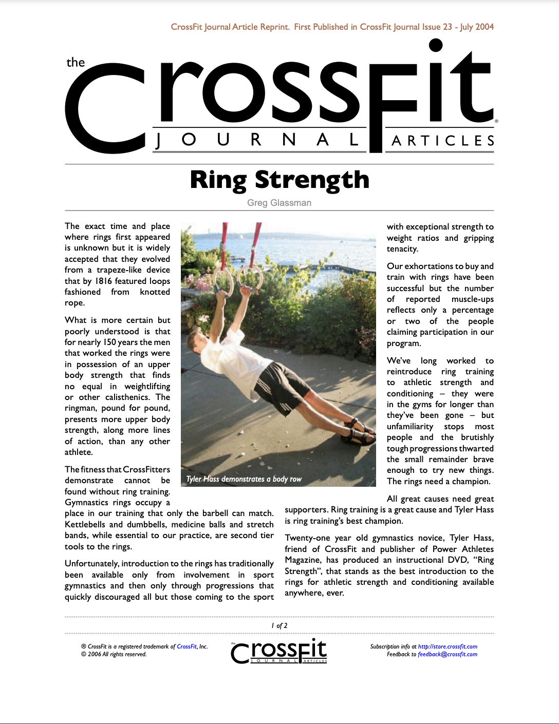 Twenty-one-year-old gymnastics novice Tyler Hass, friend of CrossFit and publisher of Power Athletes Magazine, has produced an instructional DVD, “Ring Strength,” that stands as the best introduction to the rings for athletic strength and conditioning available anywhere, ever.