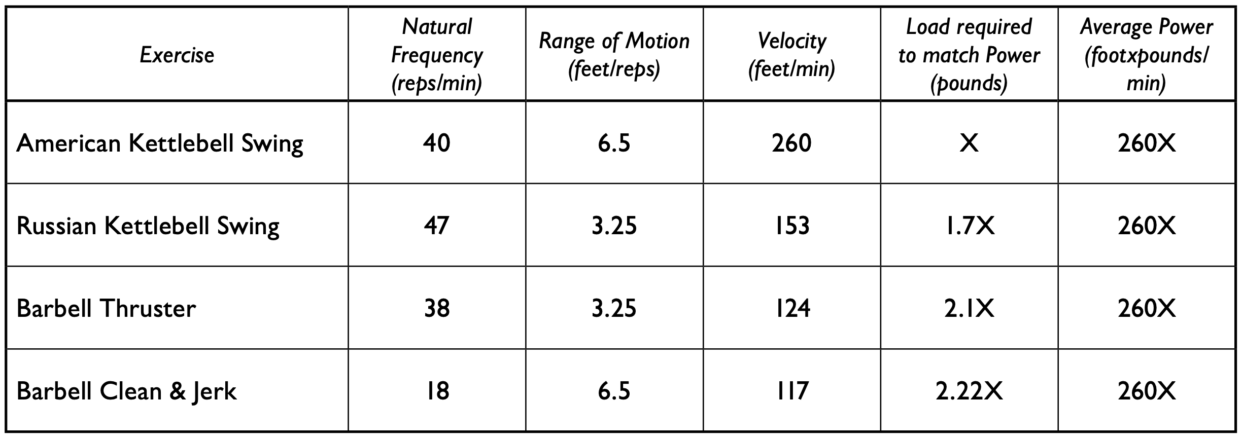 From watching videotape we’ve determined the natural frequency of the American kettlebell swing, the Russian swing, the thruster, and the clean and jerk.