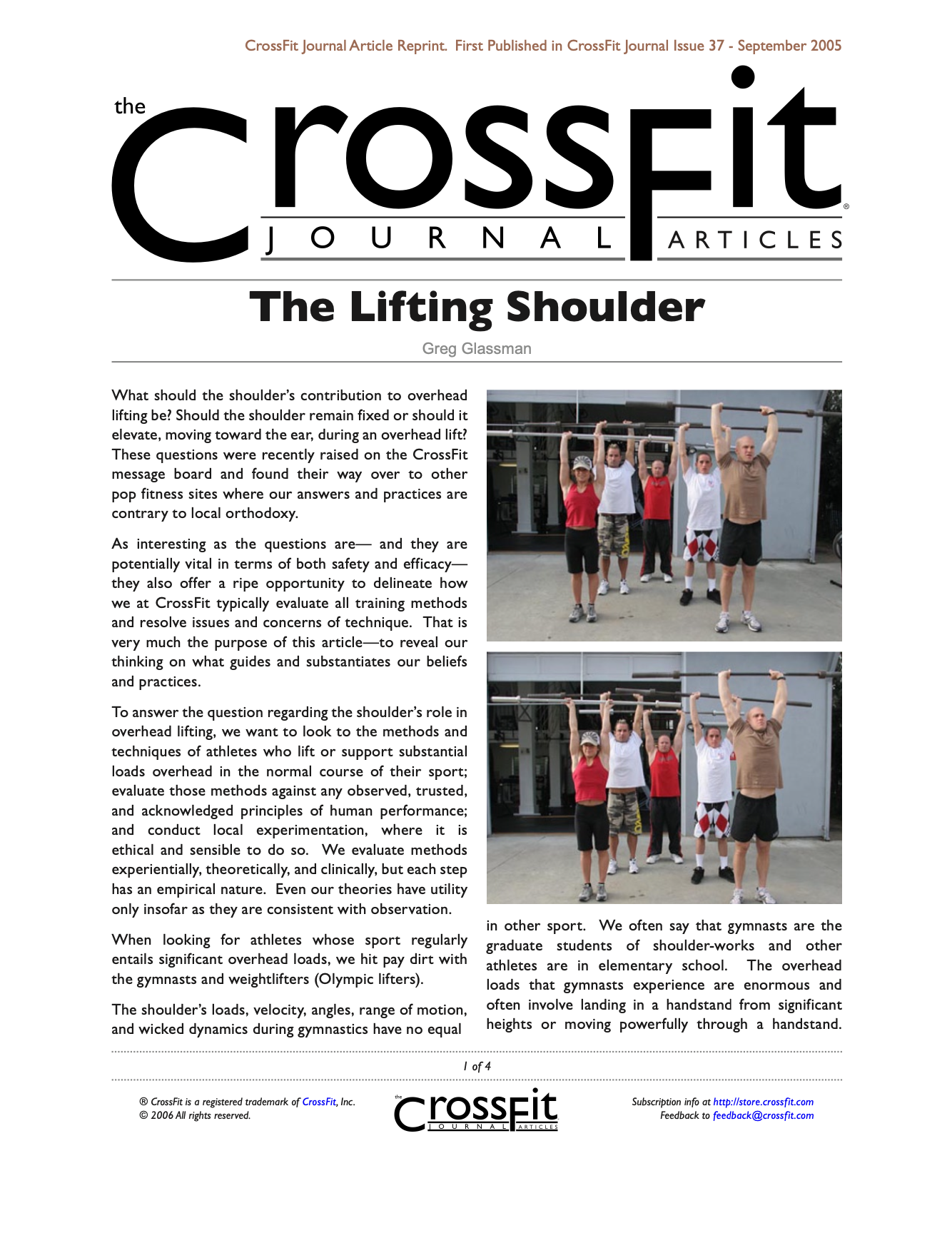 How have CrossFitters fared lifting overhead with an active shoulder? Like the weightlifters and gymnasts, we have no reason to suspect any significant causal relationship between our overhead lifting and shoulder injury. In fitness communities where overhead lifting is reportedly injurious, there is typically clear evidence of inactive, or passive, shoulder involvement while lifting overhead.