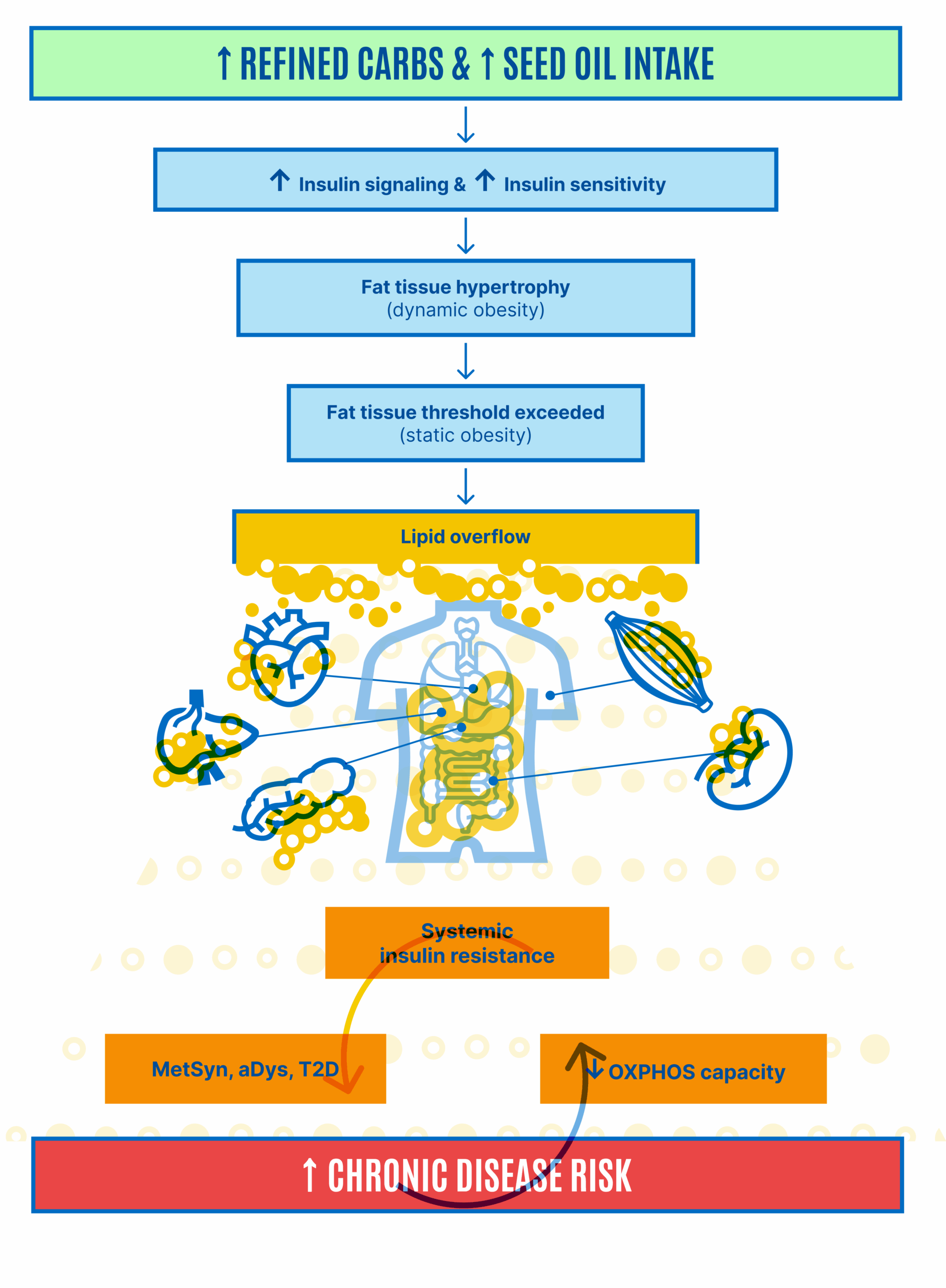 The ROS hypothesis, proposed by Petro Dobromylskyj in 2012,1 The hypothesis was proposed by Petro Dobromylskyj in 2012. He has honed the hypothesis ever since, sharing theses developments in a series of posts on his blog. The “Protons” series comprises 77 posts at the time of this writing (October 28 2024). Perspectives related to the hypothesis are not limited to this series. Many more posts on his blog besides the Protons series contain information and insight relevant to the ROS hypothesis. suggests that consumption of polyunsaturated fats, such as linoleic acid, exacerbates fat storage, whereas saturated fats help limit it. The relatively recent shift in fat types, driven by the fear of saturated fats and the push towards polyunsaturated fats to purportedly reduce heart disease risk, may have inadvertently fueled the obesity epidemic.