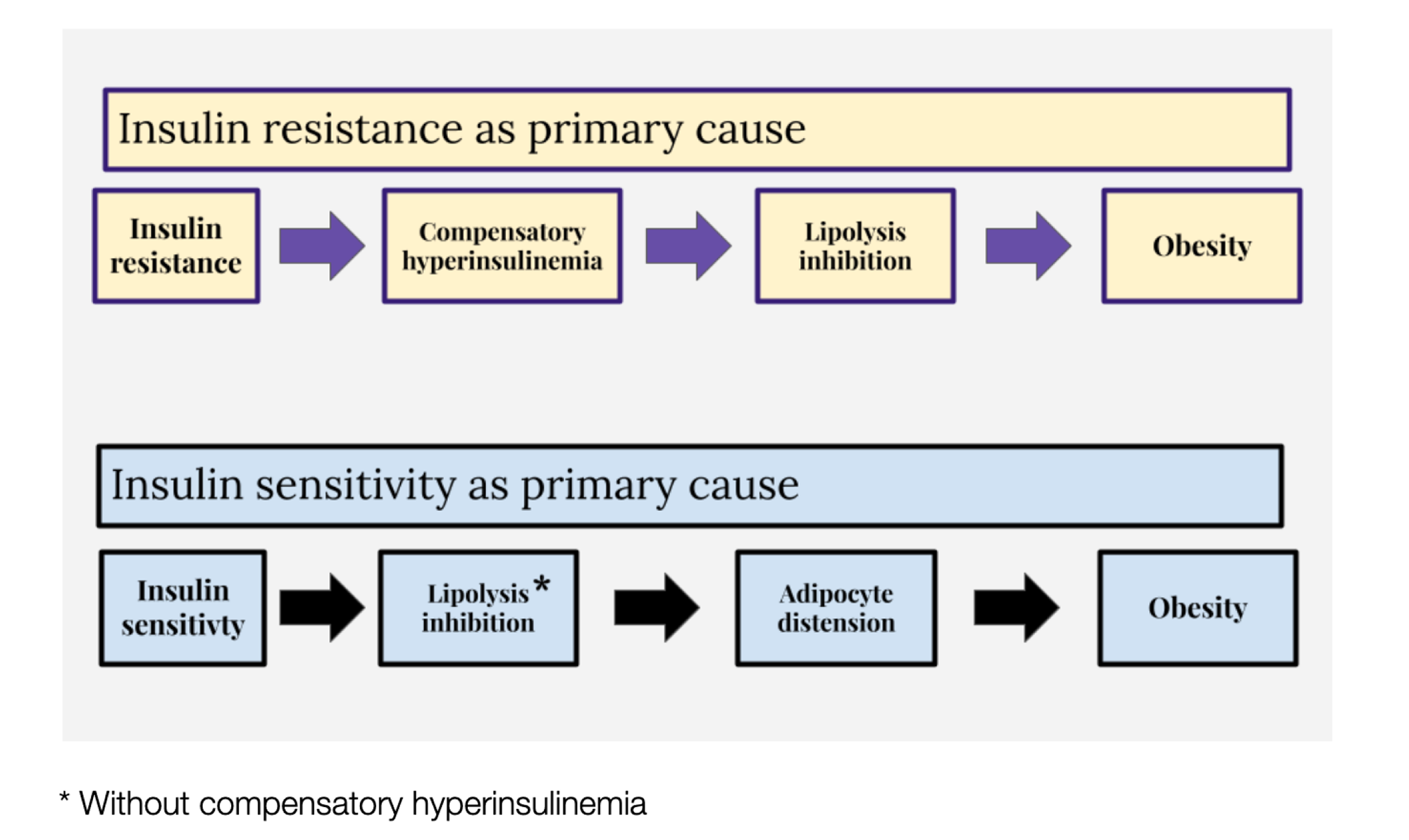 One model of obesity holds that insulin resistance is the underlying cause. If insulin resistance occurs, compensatory hyperinsulinemia follows, especially with the consumption of rapidly digestible carbohydrates. The amount of insulin required to maintain normal blood glucose is in considerable excess of that needed to inhibit lipolysis — the process of breaking down stored fat to mobilize it for energy use. This leads to obesity (Figure 3, upper panel).