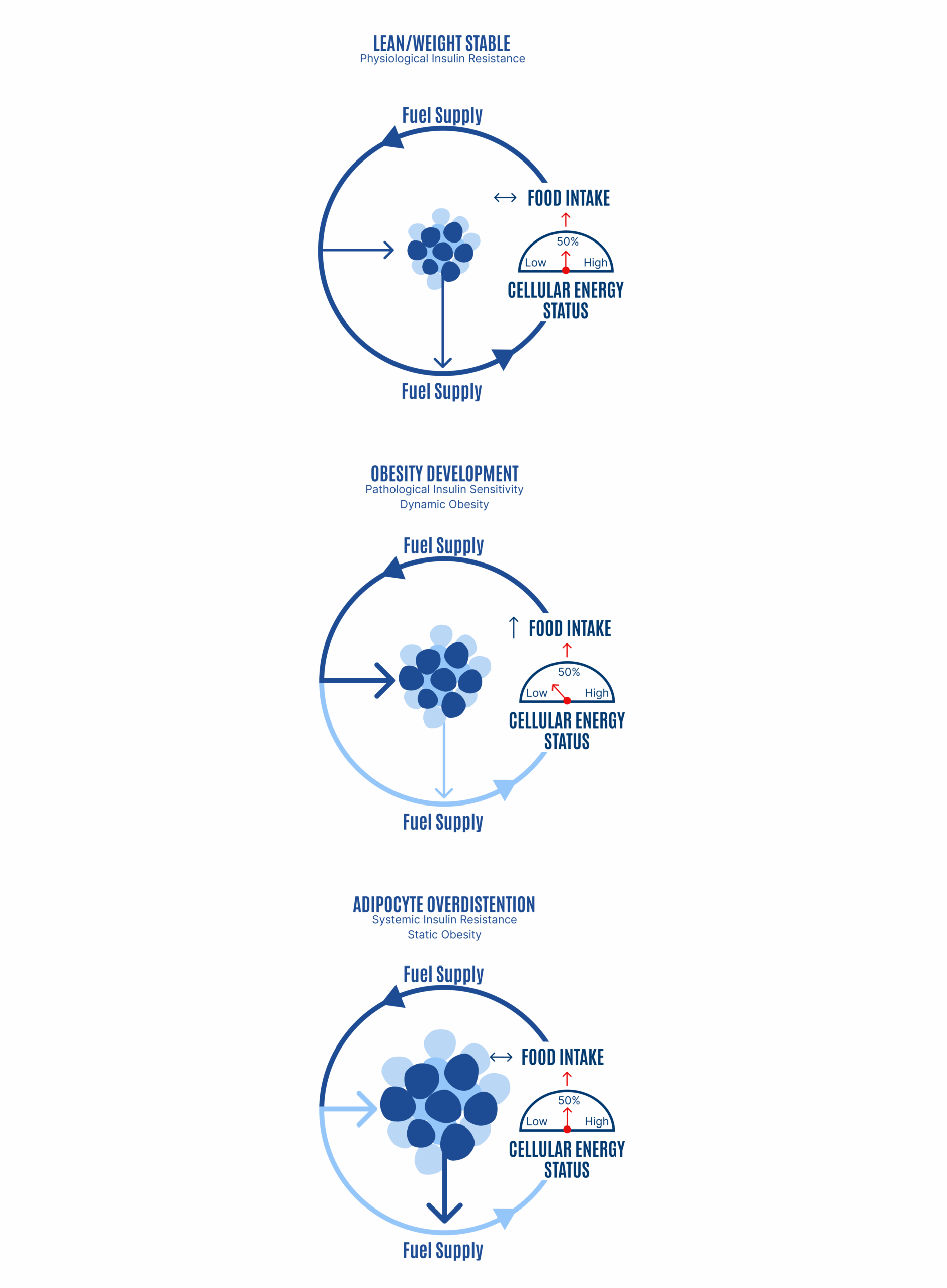 Adipocytes distend until the rate of storage into the adipocytes is matched by the increasing rate of basal lipolysis and the FFAs they spill out: a settling point where the competition of forces between mobilization and deposition appears to be in a state of balance (Figure 5, lower panel). The inability of insulin to suppress excessive basal lipolysis also results in systemic insulin resistance. The individual effectively progresses from a period of internal starvation (Figure 5, middle panel) to nutrient overload and lipotoxicity (Figure 5, bottom panel and Figure 6).
