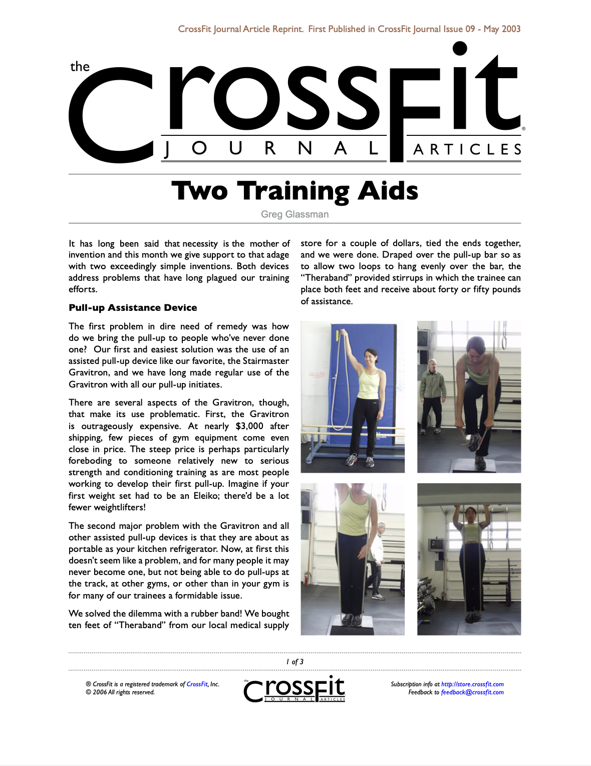 We solved the dilemma with a rubber band! We bought 10 feet of “Theraband” from our local medical supply store for a couple of dollars, tied the ends together and we were done. Draped over the pull-up bar so as to allow two loops to hang evenly over the bar, the “Theraband” provided stirrups in which the trainee can place both feet and receive about 40 or 50 pounds of assistance.