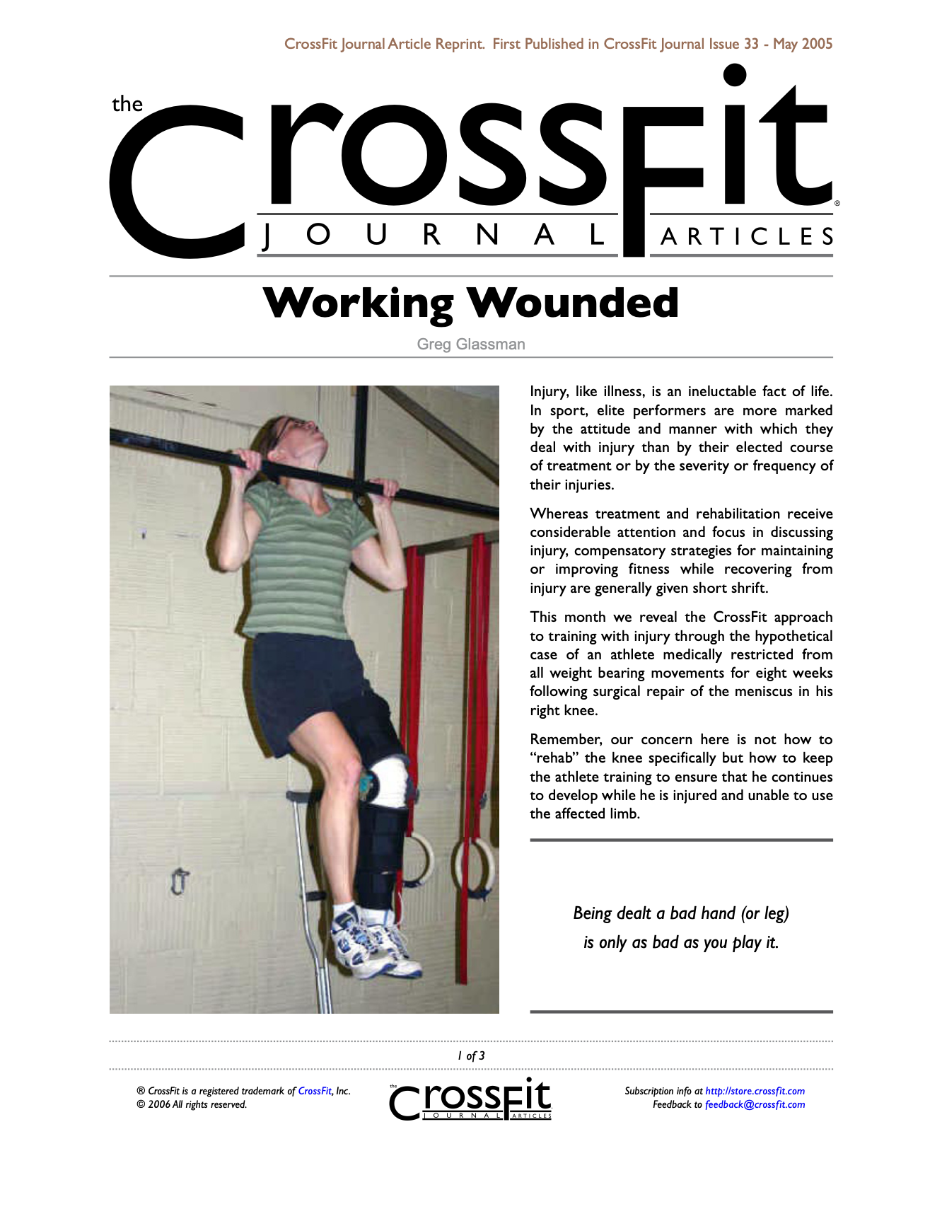 This month we reveal the CrossFit approach to training with injury through the hypothetical case of an athlete medically restricted from all weight-bearing movements for eight weeks following surgical repair of the meniscus in his right knee.